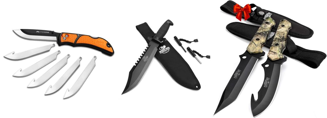 - Two essential knives for hunting and game processing: a straight edge for skinning and a gut hook for efficient field dressing.